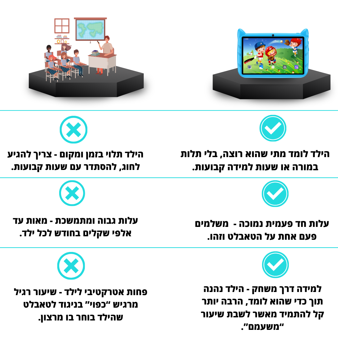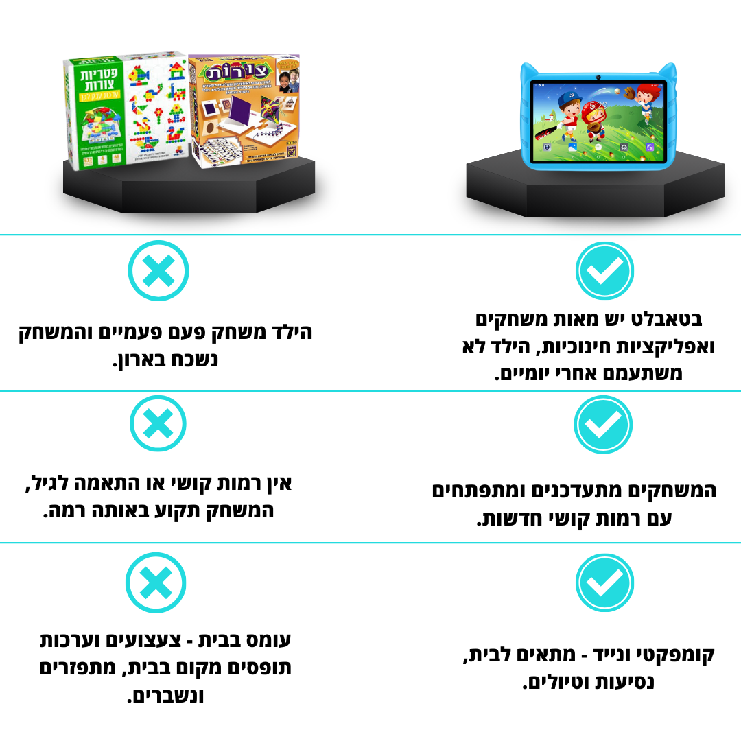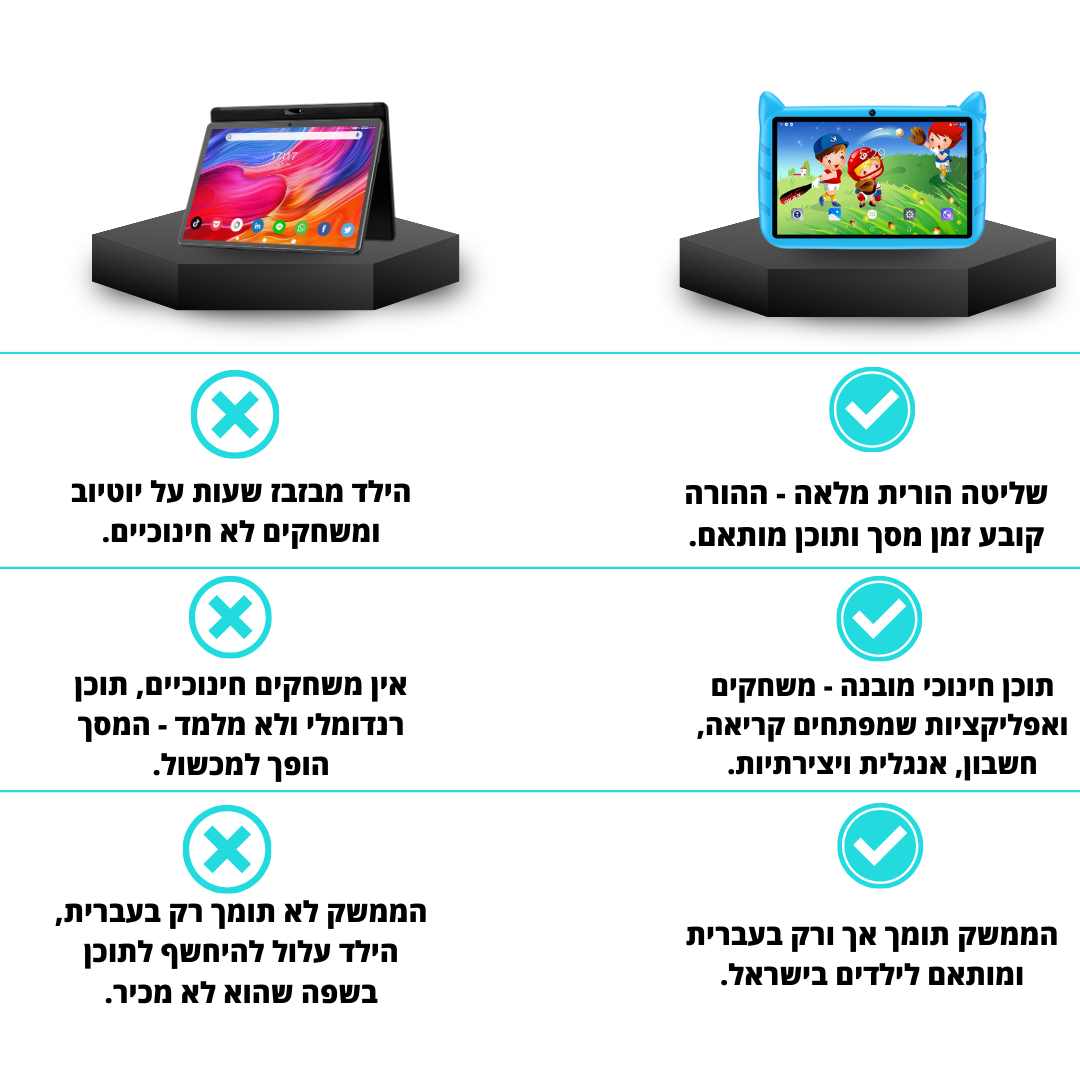 הטאבלט קל לשימוש, בטוח לילדים, וכולל שליטה מלאה להורים על זמני השימוש ותכנים.