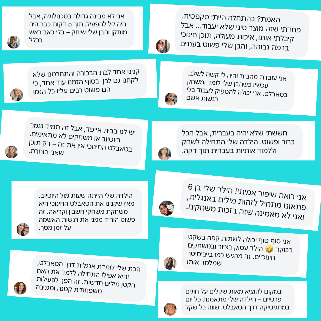מדווחים שבזכות הטאבלט החינוכי של ™Tevalor הזמן מסך של הילדים שלהם הפך ללמידה אמיתית!
